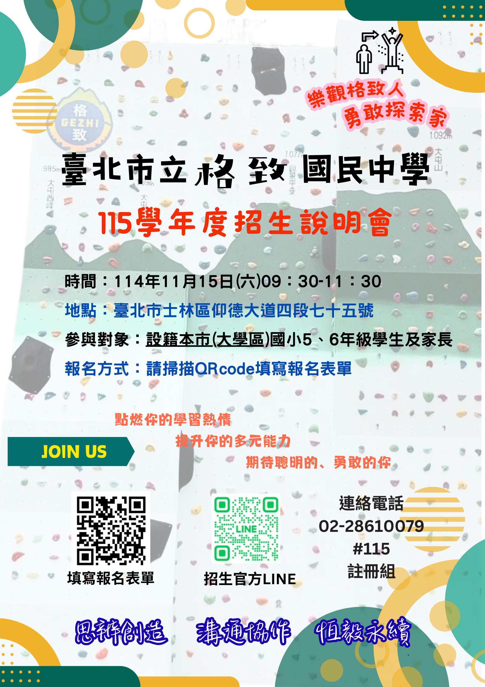 二、本校為大學區學校,凡設籍臺北市之新生皆可就讀。為使 更多學生及家長了解本校辦學資訊,特辦理旨揭說明會, 敬請轉知貴校五、六年級之學生,並協助公告說明會訊 息。