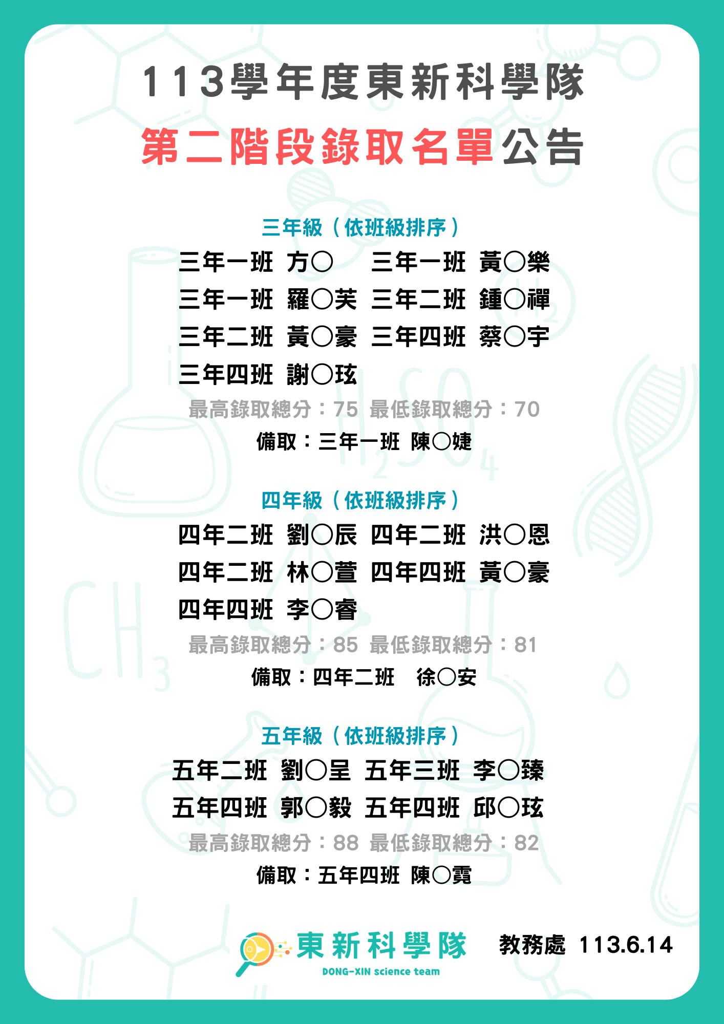 恭喜以下學生錄取113學年度第二屆科學隊,請於6/18(二)前完成報到手續,時間內未報到者安排備取遞補。