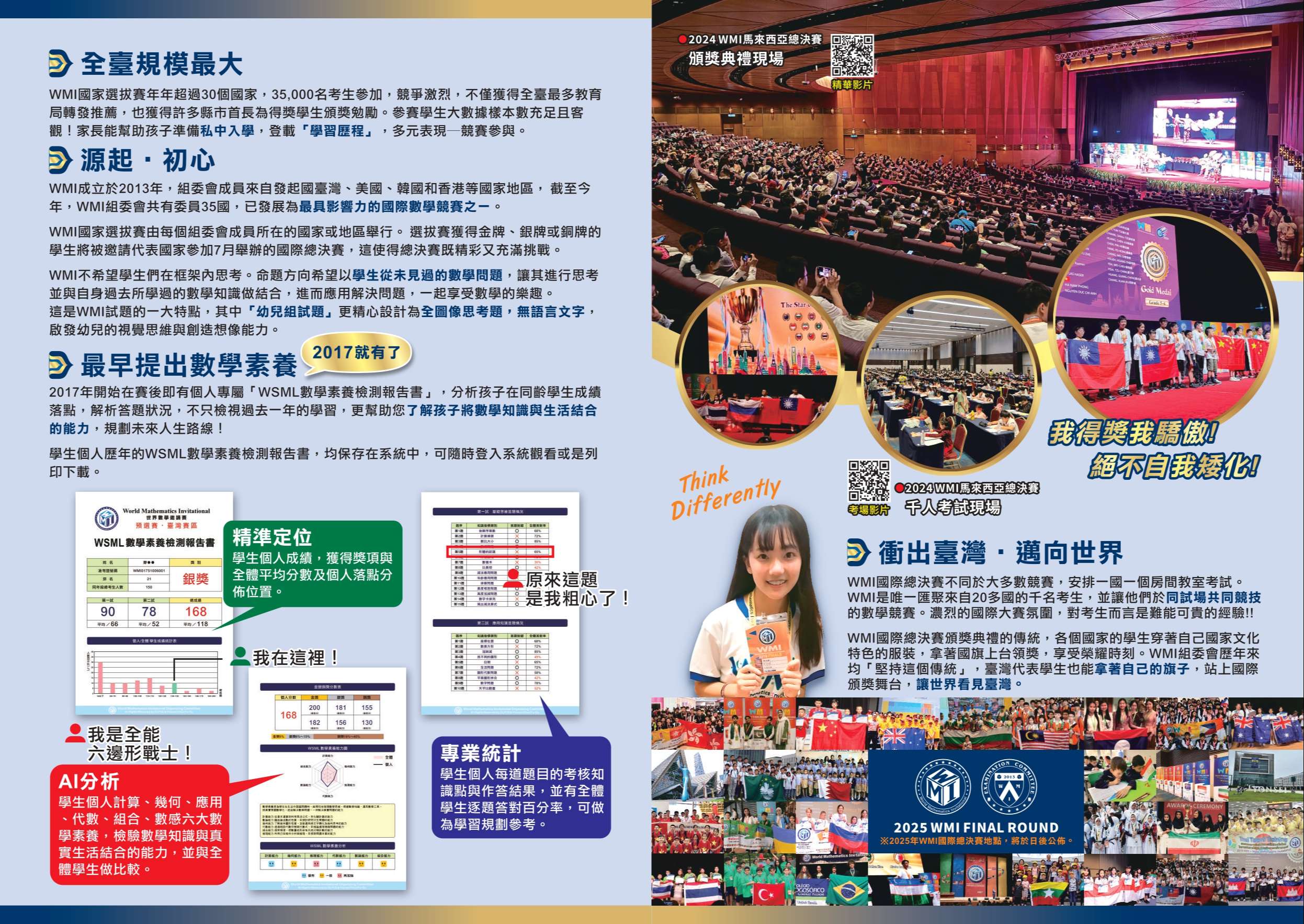 WMI世界數學邀請賽為第一個由台灣發起舉辦的國際性數學競賽,集合世界各地致力於數學推廣組織機構,每年將在不同國舉辦。凡就讀臺灣各縣市之公私立幼兒園至高中三年級之我國籍在學學生,均可報名參加,歡迎愛好數學的學生們踴躍報名,一同響應,為台灣爭取榮耀。