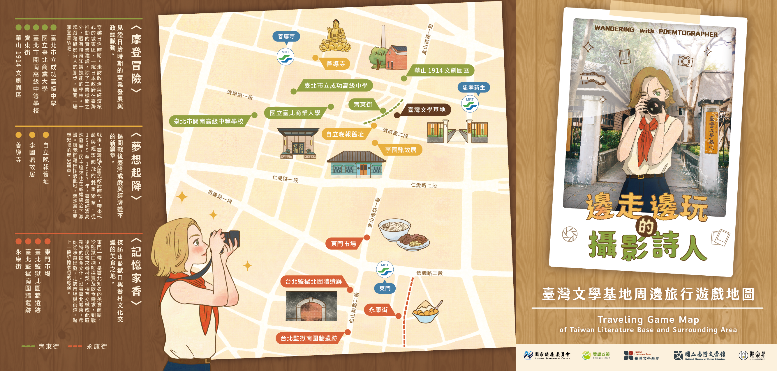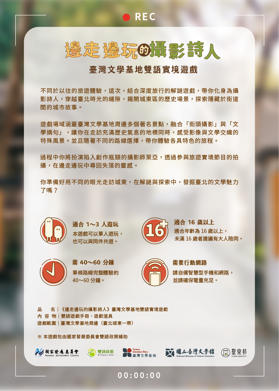 預約參加英語導覽者,可獲贈「臺灣文學基地雙語實境遊 戲包」。遊戲包內含解謎遊戲手冊,旨在引導使用者探索 城東地區文化資產,並透過雙語內容融合英語與華語學習 元素。