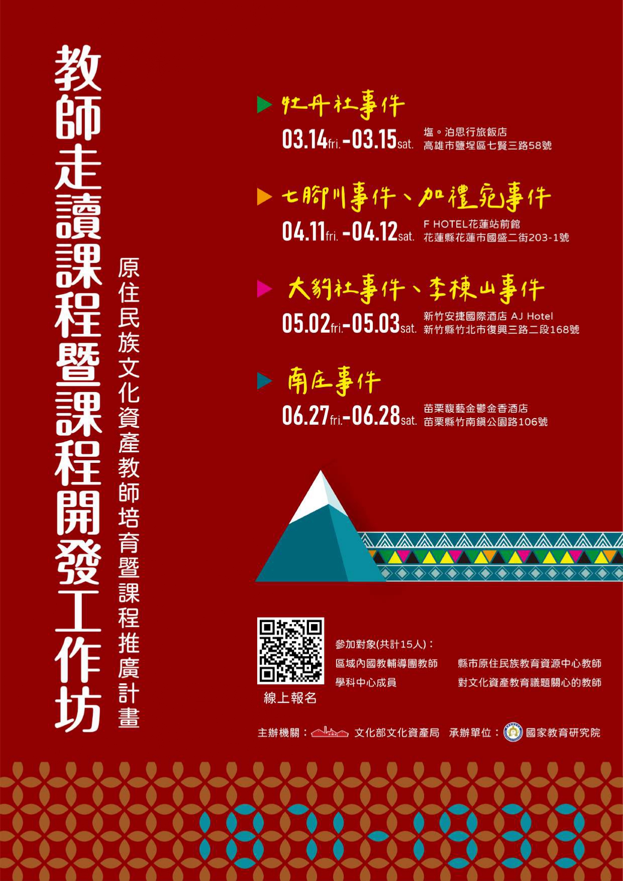 旨揭計畫依「原住民族重大歷史事件盤點暨補遺調查研究」之研究成果,擇取4個重要歷史事件較為集中或歷史脈 絡得以連貫之區域,與學科中心、縣市國教輔導團及縣市原住民族教育資源中心合作,邀請區域內國教輔導團教 師、學科中心成員、縣市原住民族教育資源中心教師,以 及對文化資產教育議題關心的教師,一同參加本案的增能 課程規劃,辦理本工作坊。