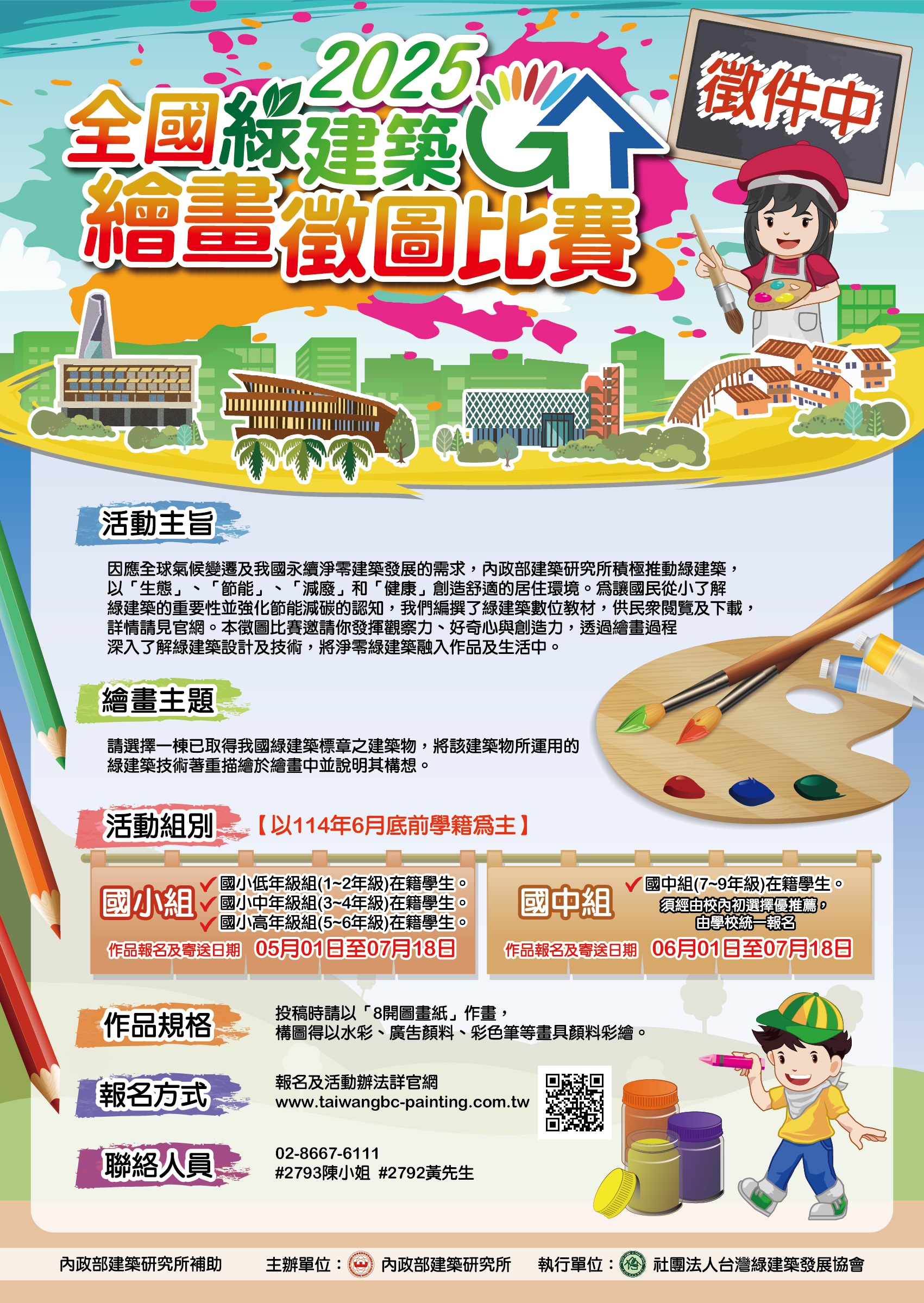 (四)活動詳情與報名資訊,請至本所補助單位社團法人台灣 綠建築發展協會比賽官網(www.taiwangbc-painting. com.tw)查詢,或撥打聯絡電話(02)8667-6111分機 2793、2792洽詢。