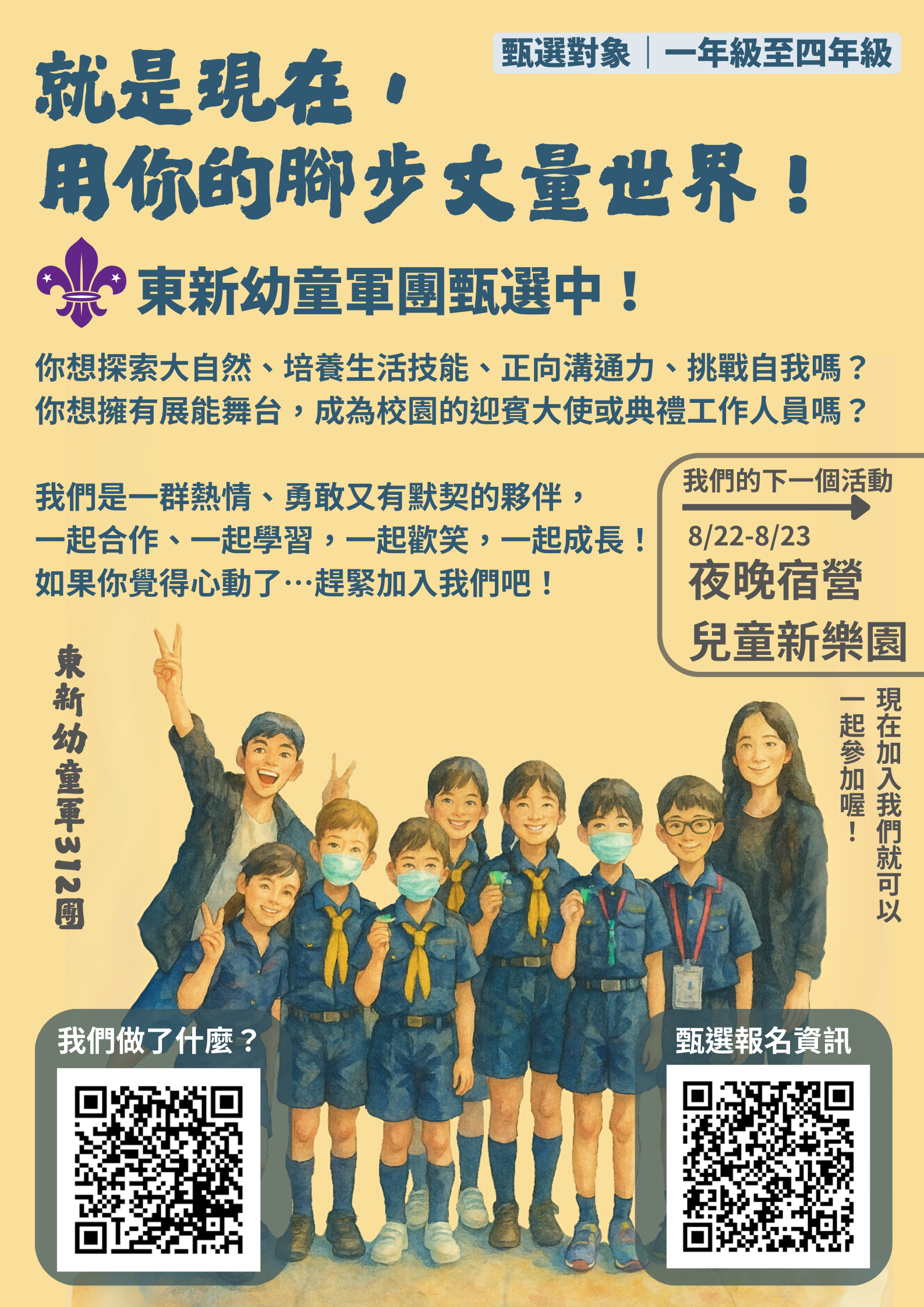 📅 課程時間:每週三 15:40~17:20(幼童軍團課程)+早自習或午休時段,不定期召集成員進行訓練(約每1~2週一次)