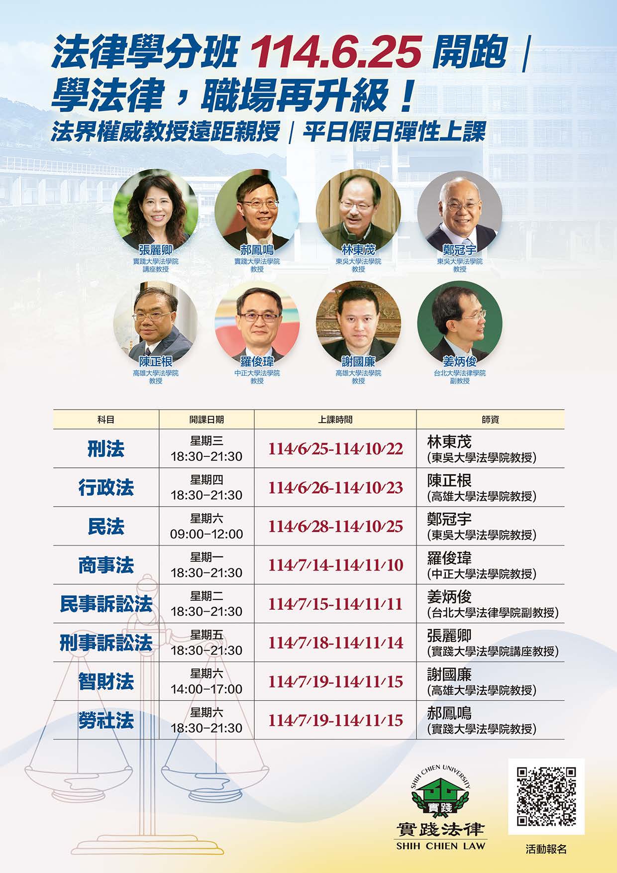 一、為協助全國國民小學教師提升法律素養與教學專業能力, 本校法學院特開設推廣教育「法律學分班」,課程涵蓋民 法、刑法、行政法、商事法、民事訴訟法、刑事訴訟法、 智慧財產權法及勞動社會法等核心法學基礎課程,由法界 權威教授遠距親授,兼顧理論與實務應用。