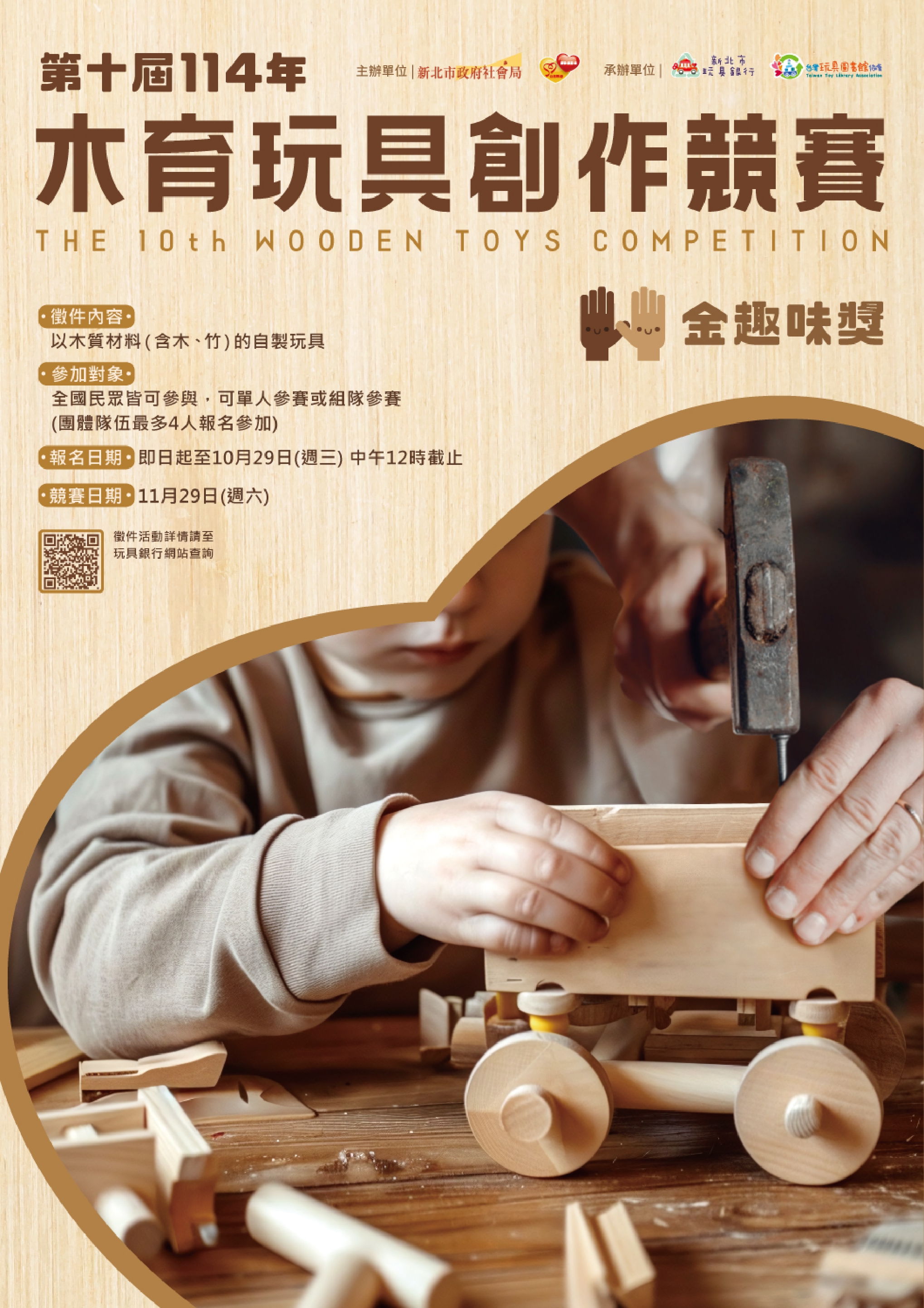 一、台灣玩具圖書館協會與新北市政府社會局合作辦理《114木育玩具創作競 賽-第十屆金趣咪獎》,誠摯邀請貴校師生參與競賽活 動。