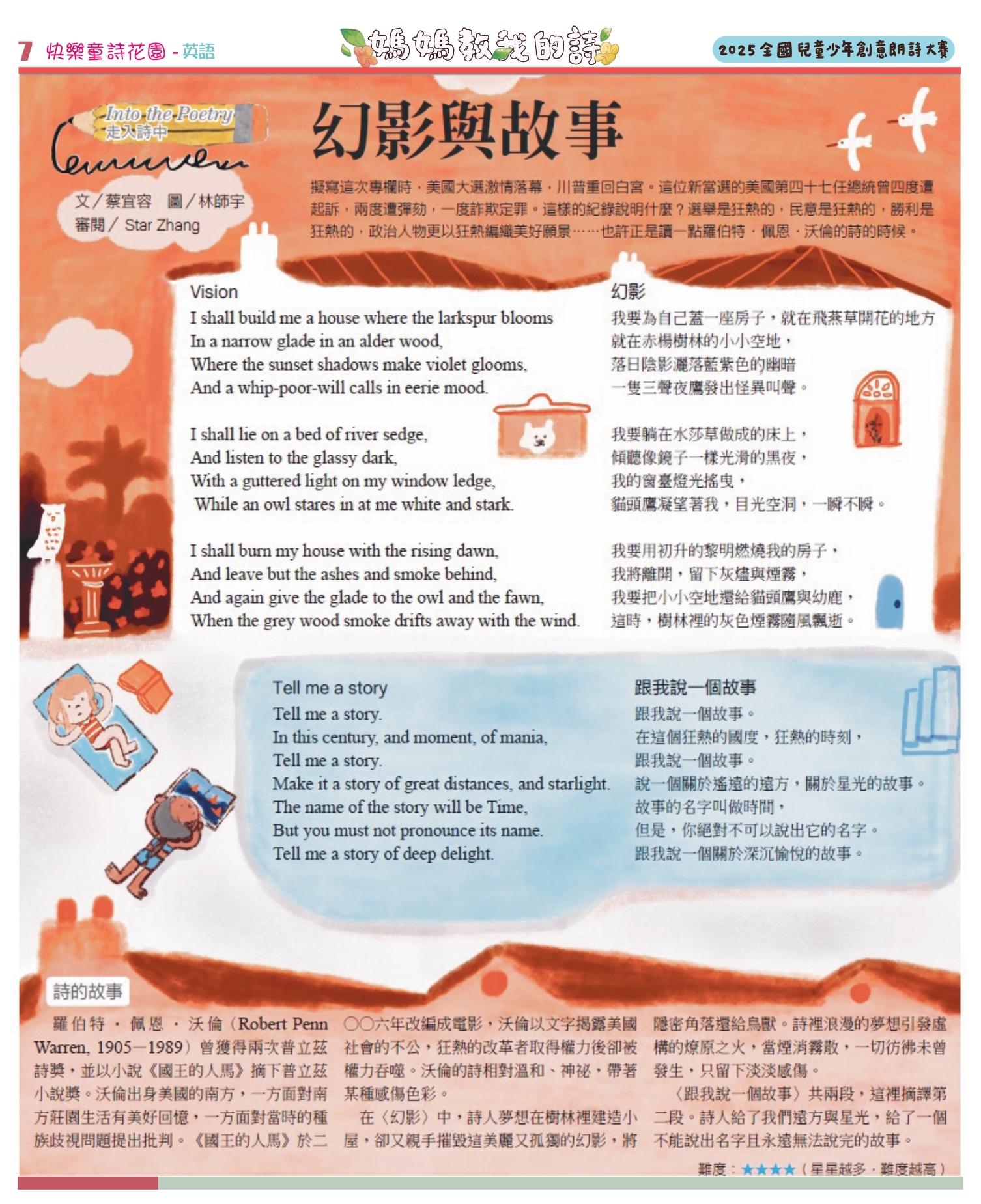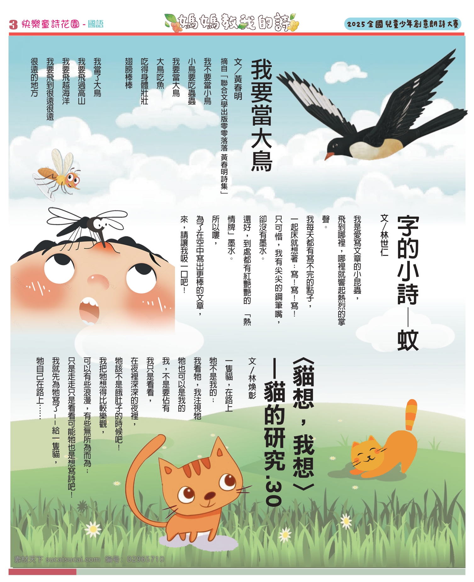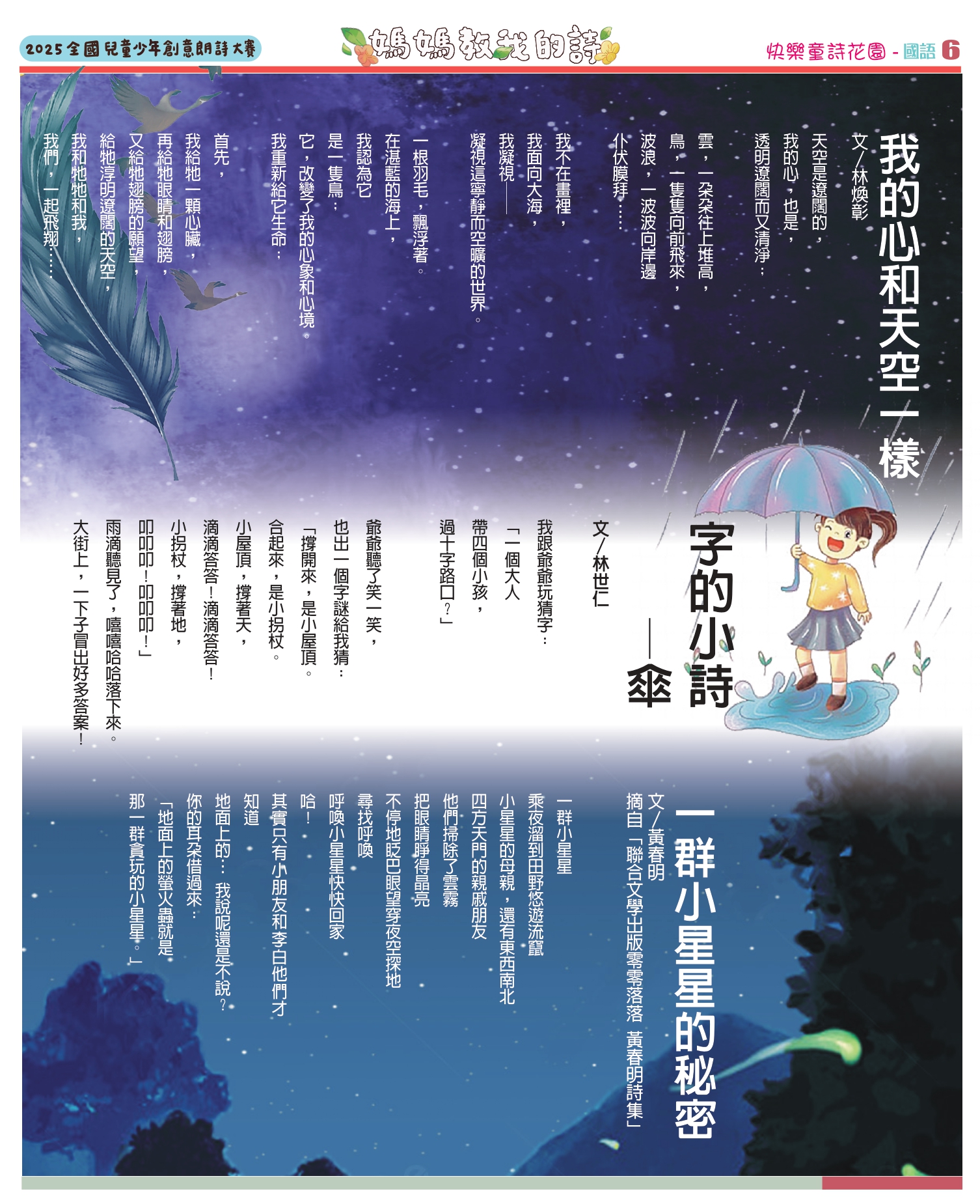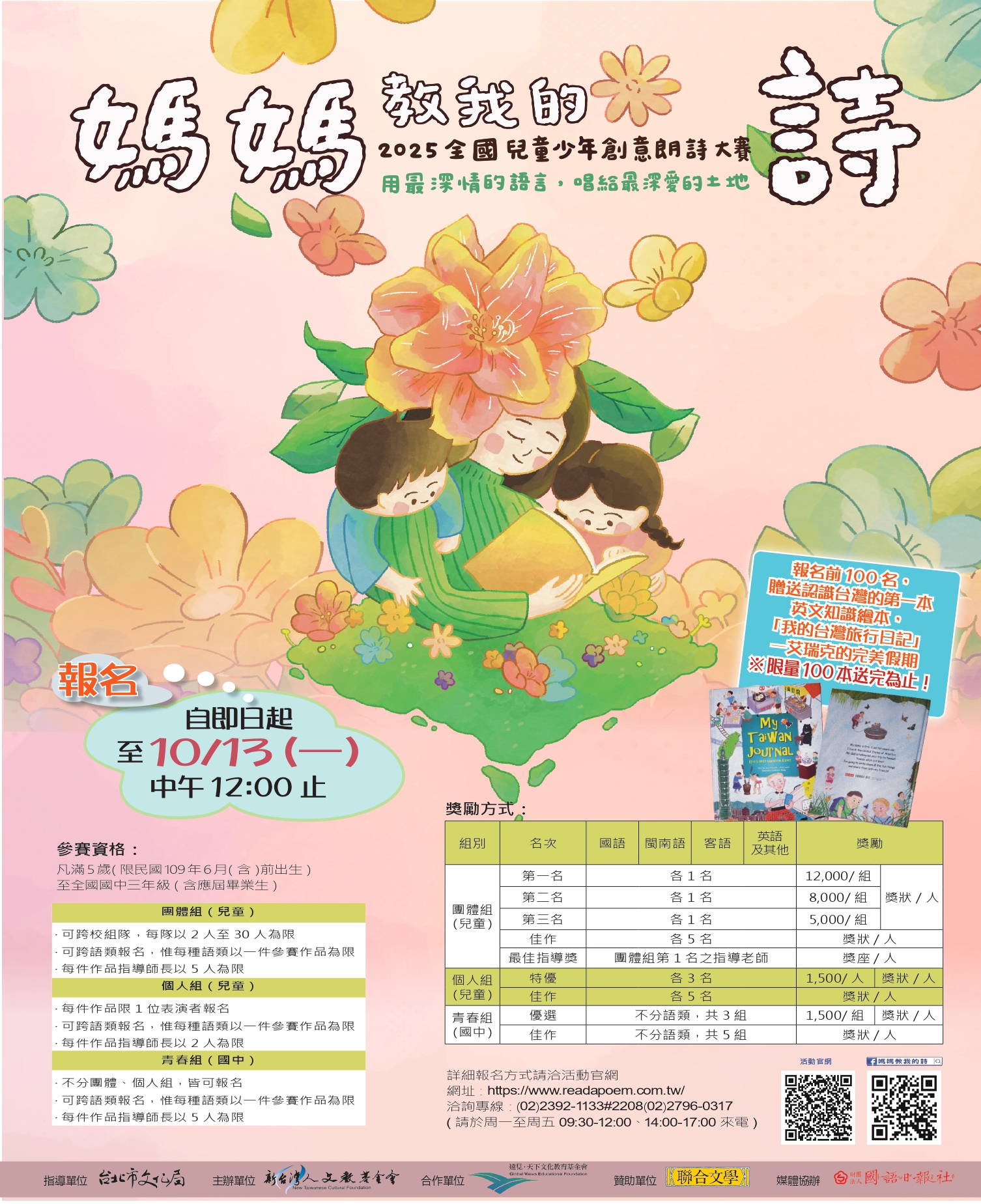 一、為促進學生透過朗讀詩作,認識母語文化,本社與新台灣 人文教基金會合辦「2025《媽媽教我的詩》全國兒童少年 創意朗詩大賽」。