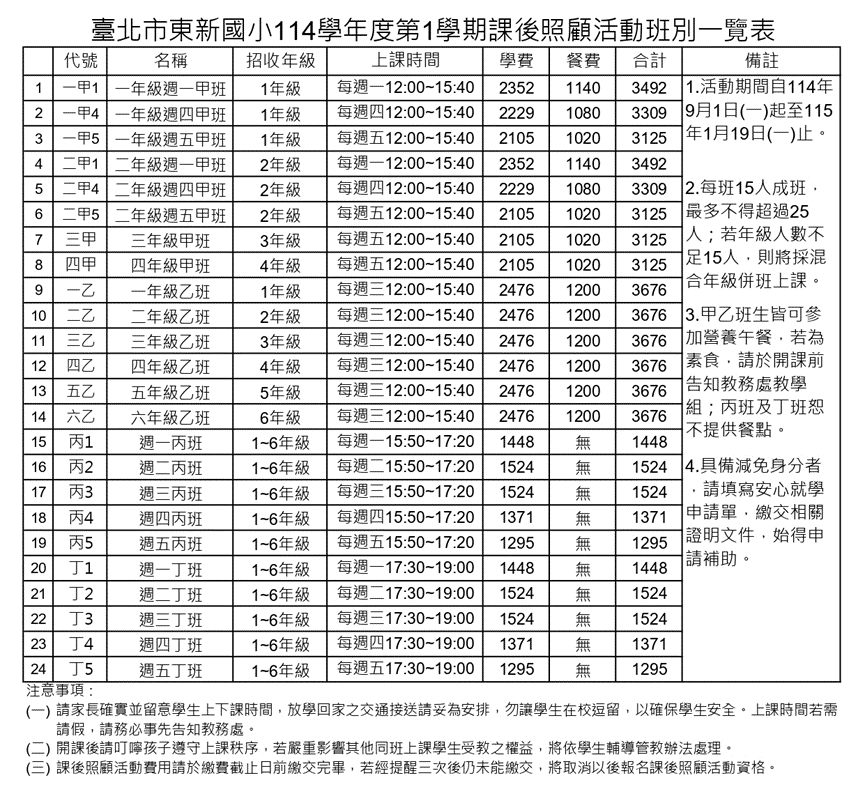 114學年度第一學期課後照顧活動於114年8月4日(一)9:00至114年8月13日(三)17:00止,請進入東新國小校內報名專區http://www3.thes.tp.edu.tw/linkmwlz2wxe點選【課後照顧班報名專區】報名