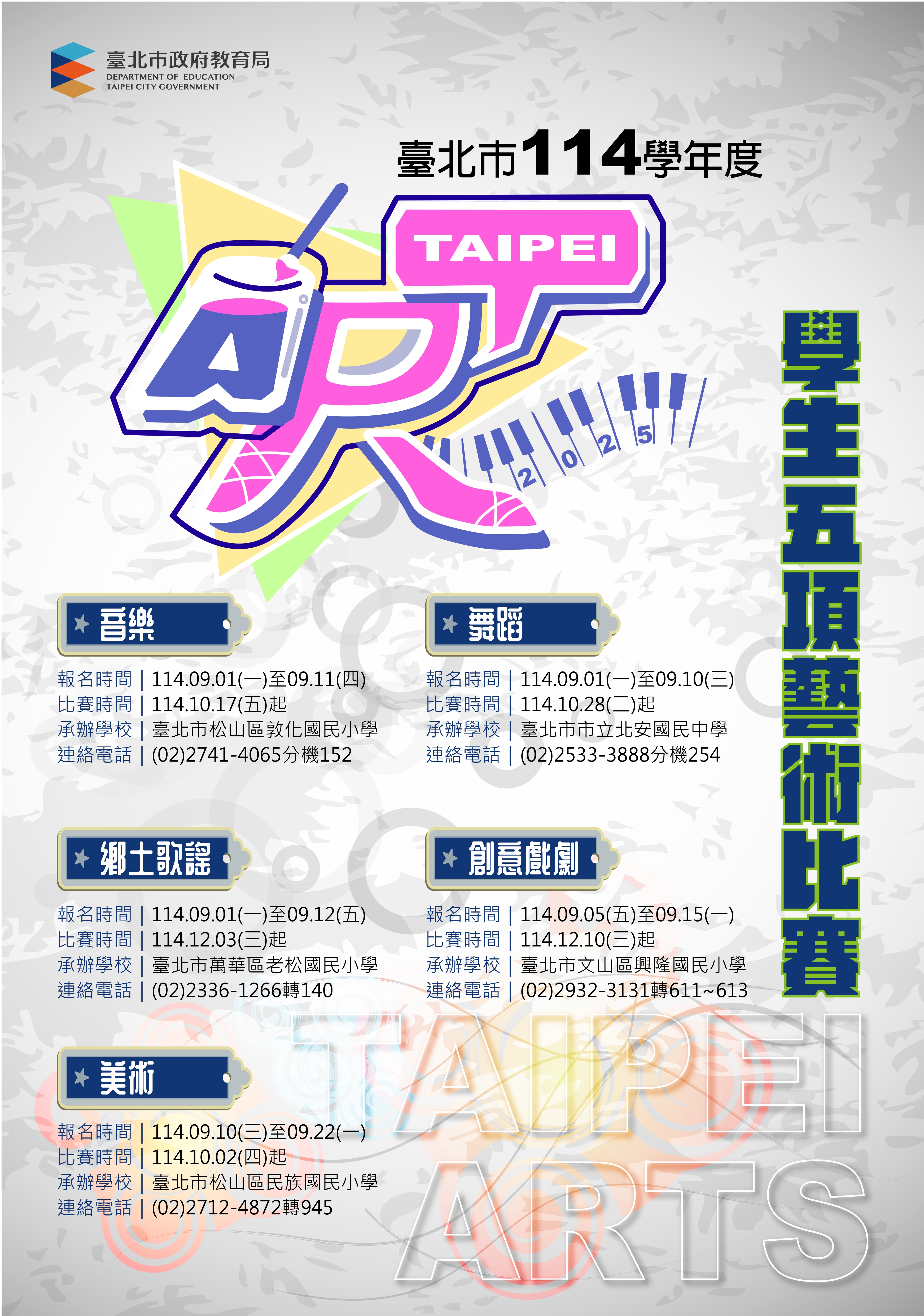 三、檢附本市114學年度學生五項藝術比賽時程表1份及海報2 份,請協助列印公告周知。實施計畫電子檔可至本市五項 藝術比賽網站(網址:https://www.tpcityart.tp.edu.tw/)下載。