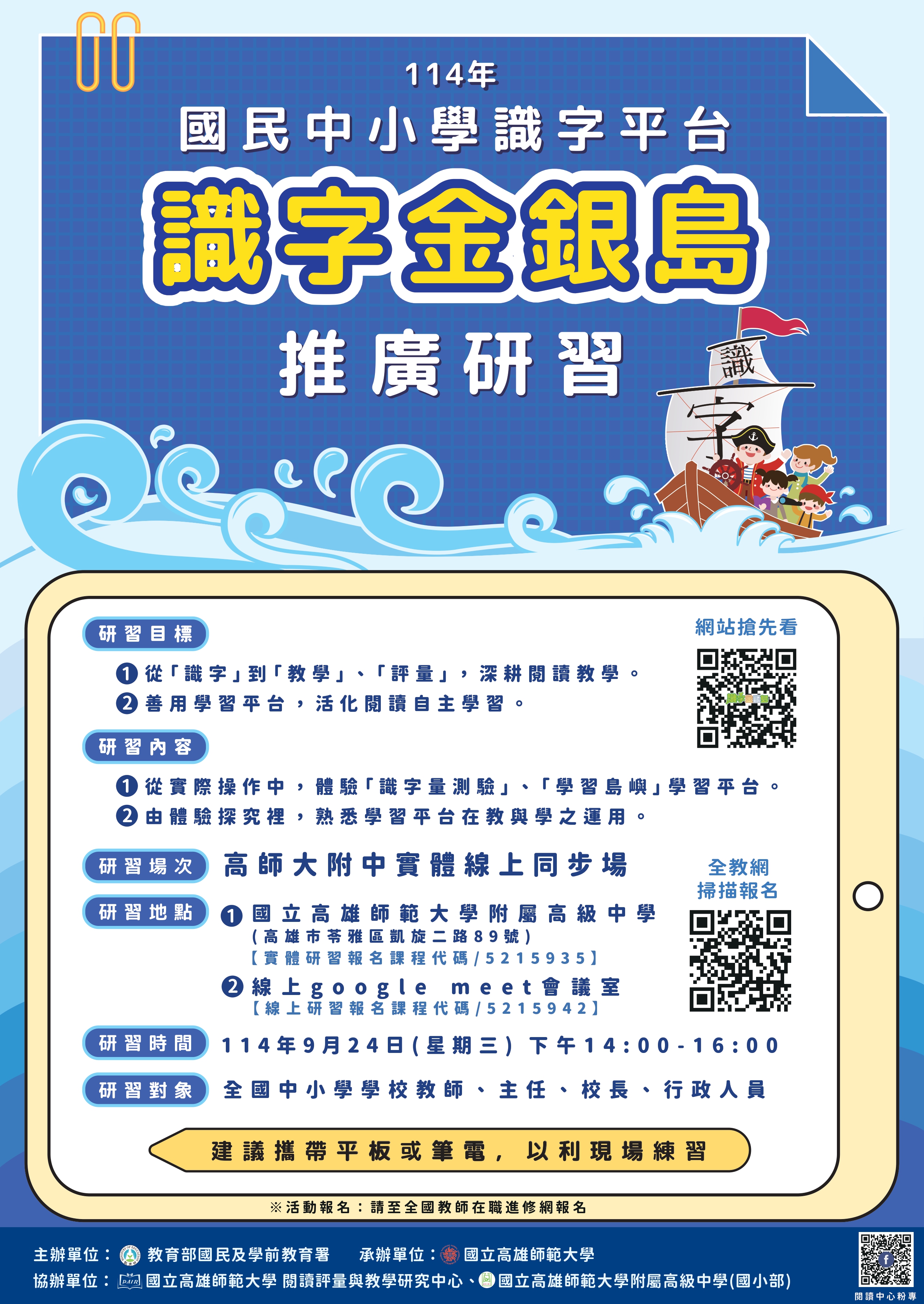 (一)本研習將介紹「識字金銀島」數位整合學習平臺,針對 其「識字量測驗」與「學習島嶼」等核心功能進行介紹 與實作,協助教師應用於國中小教學現場,熟悉操作方 式以提升教學成效。