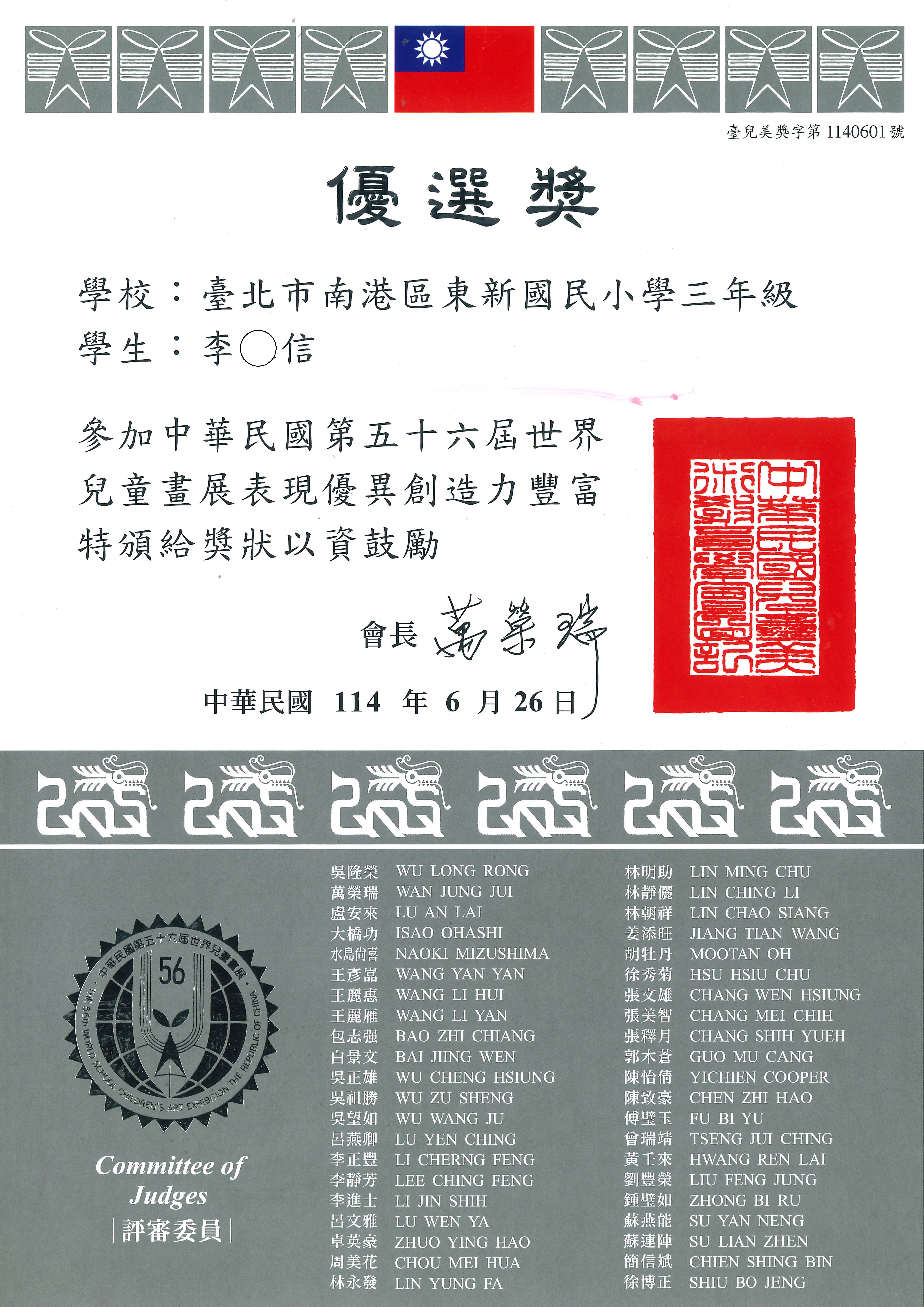 本校學生四年3班李O信於113學年度參加中華民國第56屆世界兒童畫展榮獲優選
