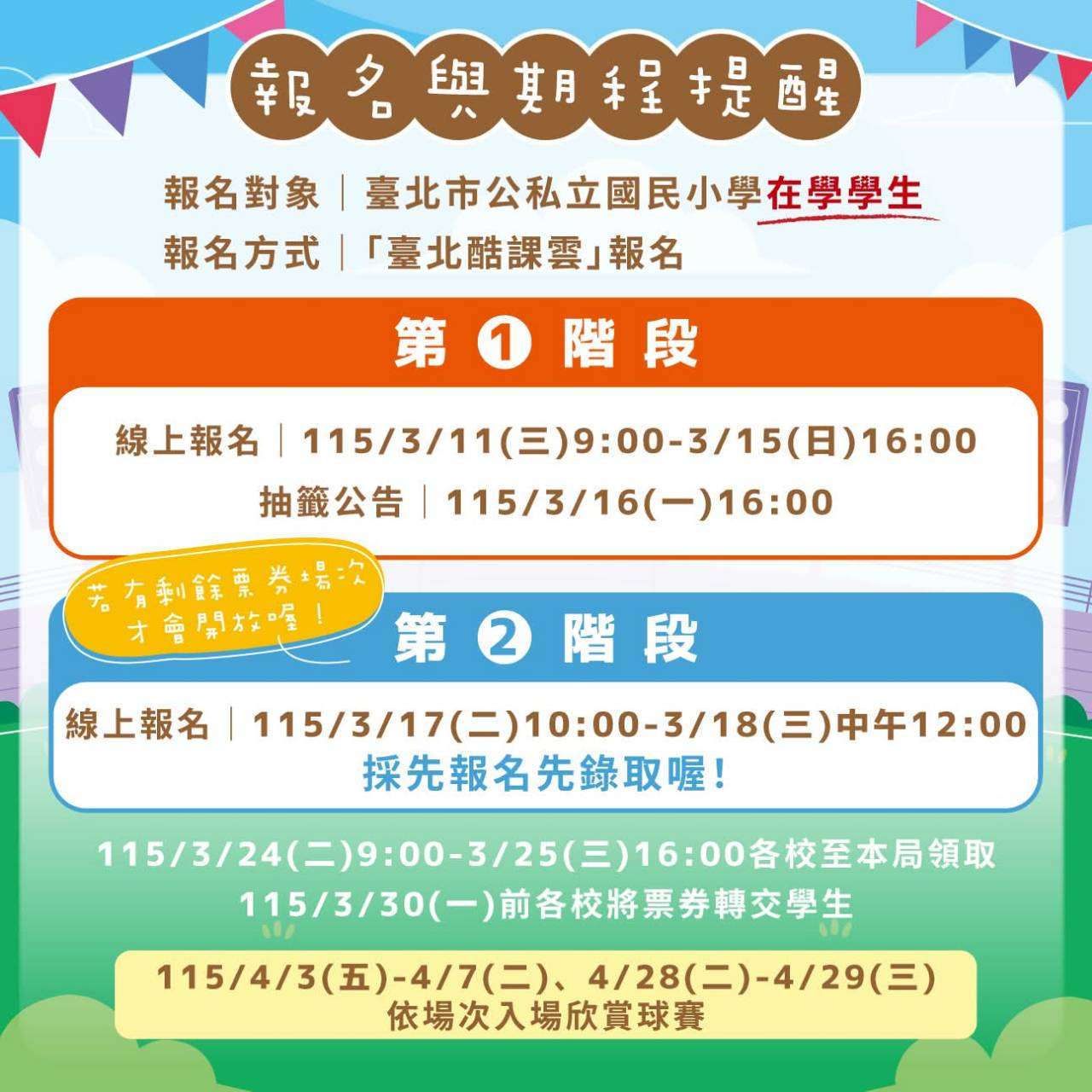 第1階段|〚線上報名〛115/3/11(三)9:00-3/15(日)16:00;〚抽籤公告〛115/3/16(一)16:00
