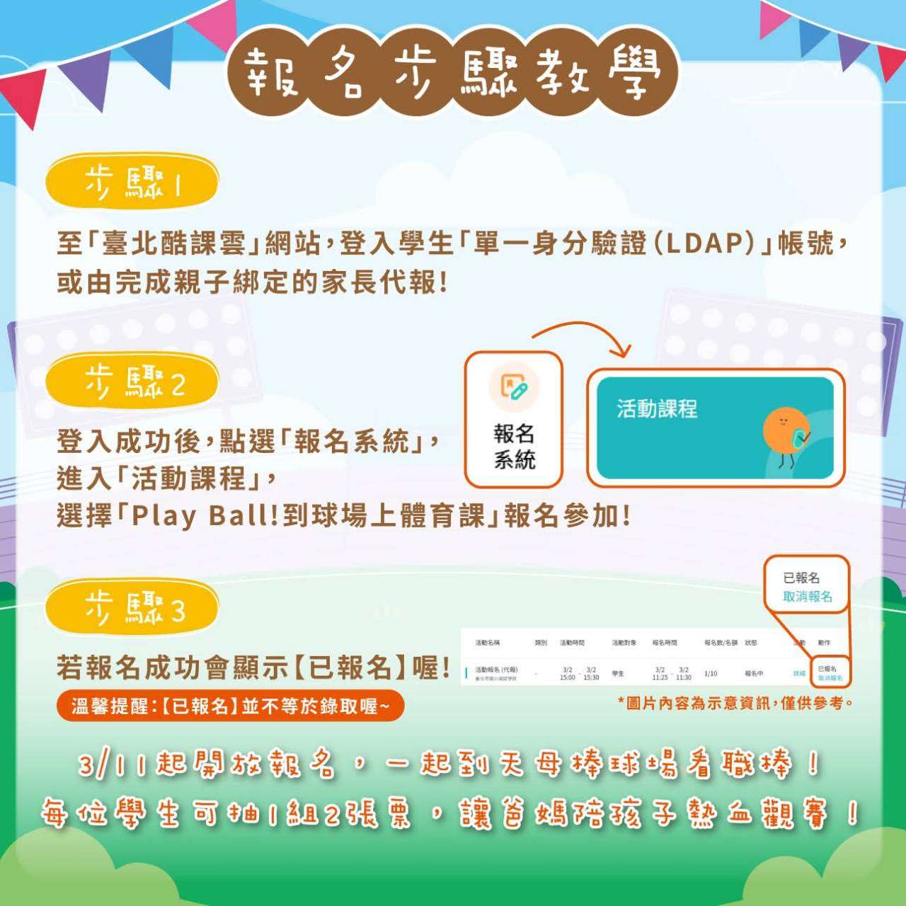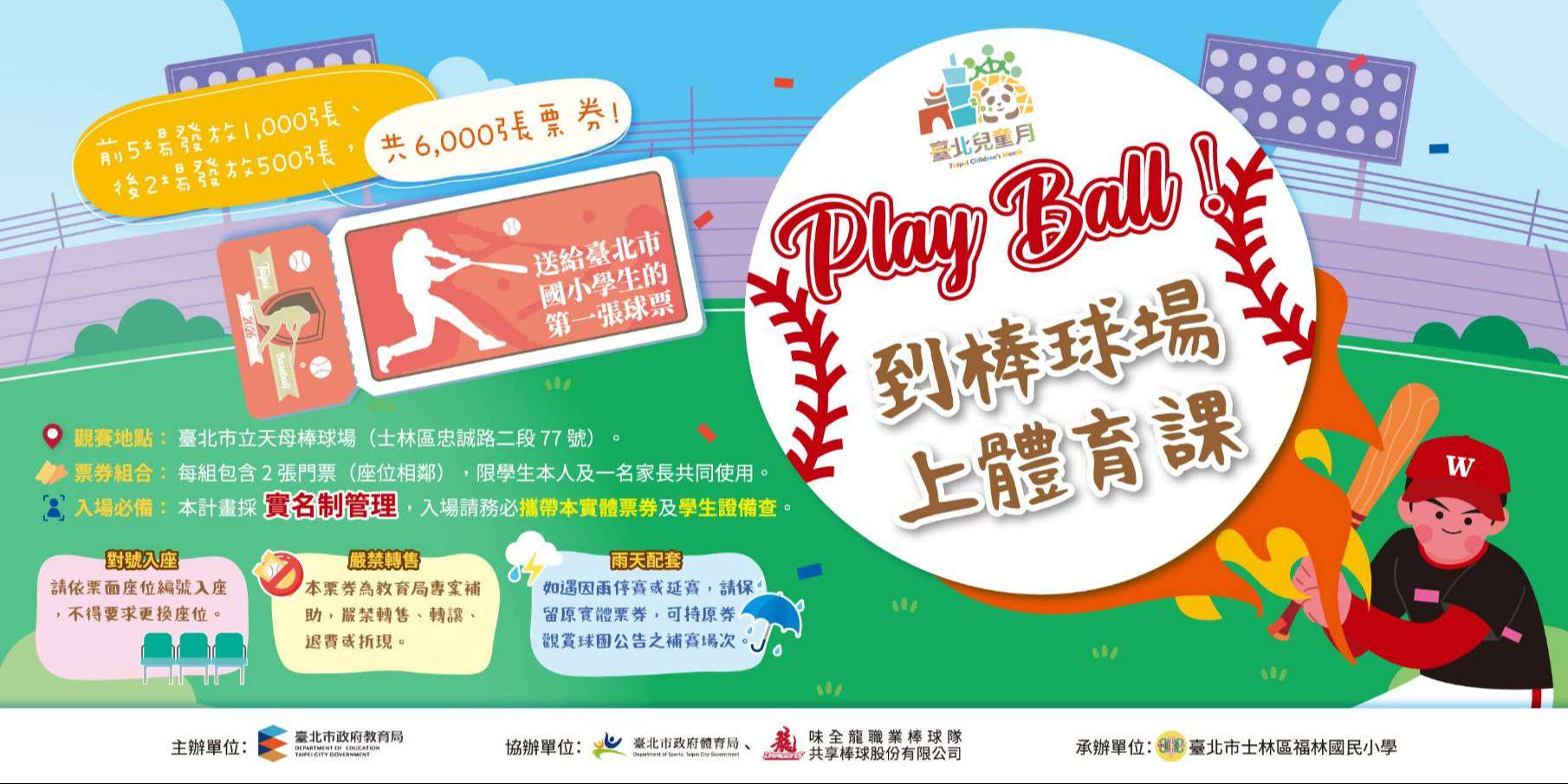 北市首度推出「#臺北市國民小學體育體驗券計畫」,鼓勵孩子走出教室、走進職業運動場域,透過真實賽事情境感受運動的熱血與魅力!活動以「#到棒球場上體育課」為主題,將在 #天母棒球場 與共享棒球股份有限公司(味全龍職業棒球隊)公益合作7場職業棒球賽事,送出3,000組、共6,000張門票,邀請北市國小學生與家長一起進場觀賽✨