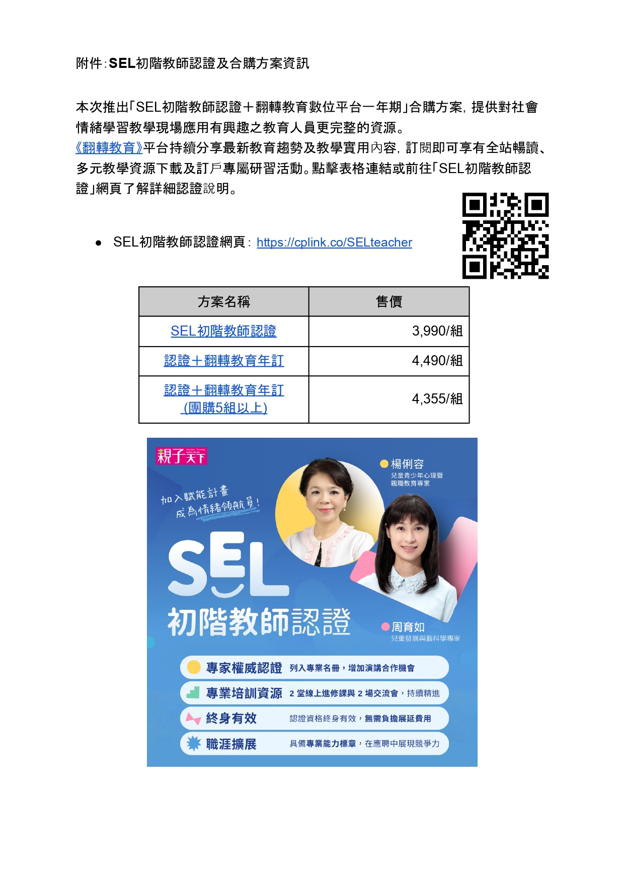 四、同時提供「SEL初階教師認證+翻轉教育數位平台一年期」 合購方案,協助對 SEL 有興趣者透過此方案持續追蹤相關 教學分享與工具資源,詳情請參閱附件。