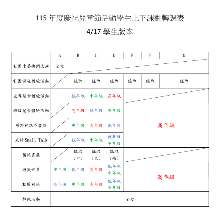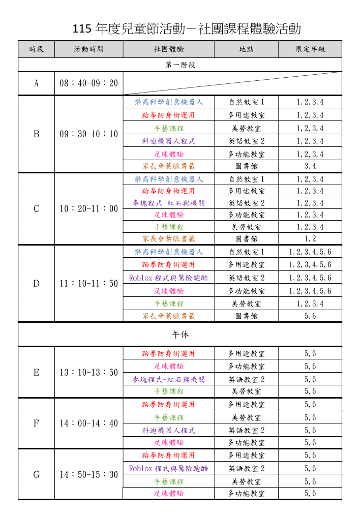 詳細課程內容請參考附件「115學年度慶祝兒童節活動社團體驗課程表.pdf」。